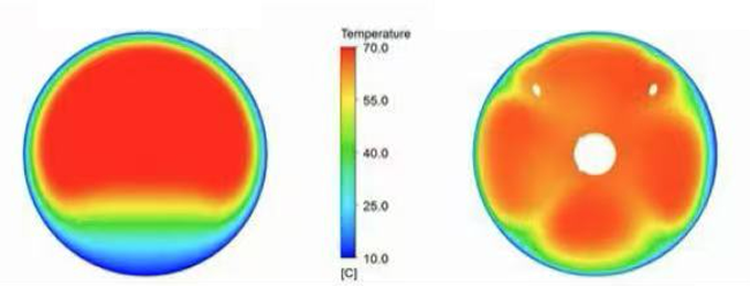 Поток жидкости по пустым трубкам не создает идеальных условий для теплопередачи при ламинарном или переходном режимах течения. Например, на рисунке ниже показана жидкость, текущая в стеклянной трубке, на стенку которой нанесены синий и красный красители.